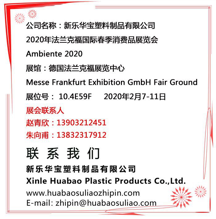 2020年法蘭克福國(guó)際春季消費(fèi)品展覽會(huì)/20.2.7-11/10.4E59F/誠(chéng)邀您的參加! 上一個(gè):全球抗新冠,華寶在行動(dòng) 下一個(gè):【拼搏2020】華寶集團(tuán)2019總結(jié)表彰暨2020迎新晚會(huì)圓滿結(jié)束